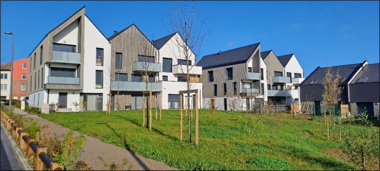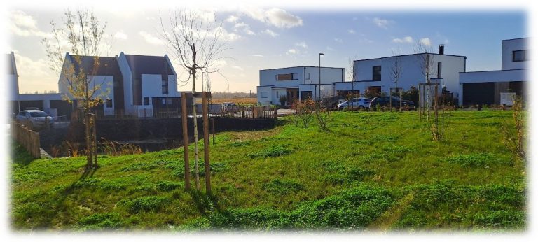L’insertion paysagère du projet a été particulièrement soignée proposant des espaces verts communs jouant un rôle paysager, écologique et hydraulique avec l’intégration de bassins paysagers pour la gestion des eaux pluviales.